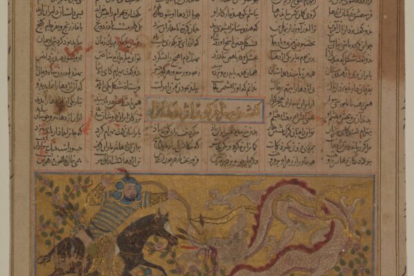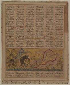 Bahram Gur zabija Azhdahę w Indiach. Folio z Pierwszej Małej Szahanamy. Prawdopodobnie Tabriz, ok. 1300 r., Biblioteka Chester Beatty; źródło: https://en.wikipedia.org/wiki/Azhdaha